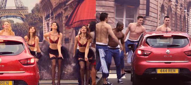 In their latest campaign for the Clio model, Renault UK decided to let test drivers live a sexy French experience in the UK: Unsuspecting guys and girls were invited by a salesman to test drive the new car and it all starts when they are asked to try the “Va Va Voom” button available on board. The British street they are in suddenly transforms into a typical Parisian street with “French” people wandering around the car. That’s not all, it becomes more interesting when French cancan dancers start a show in the men’s version and topless fit guys try to impress the female test drivers. Check out the two videos below.